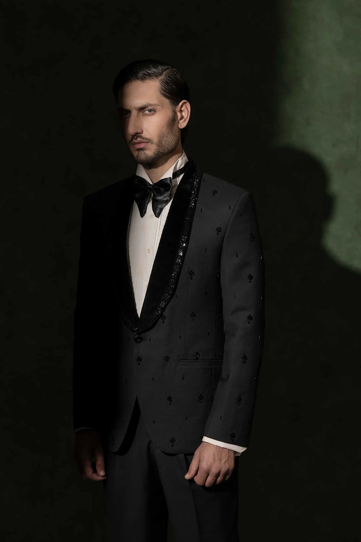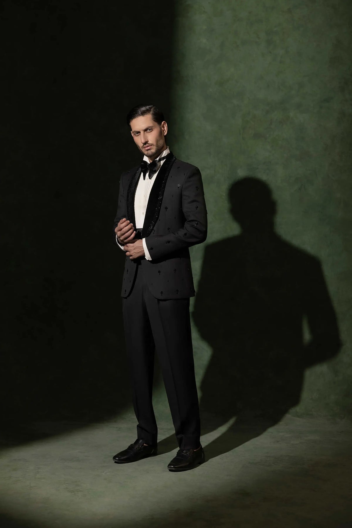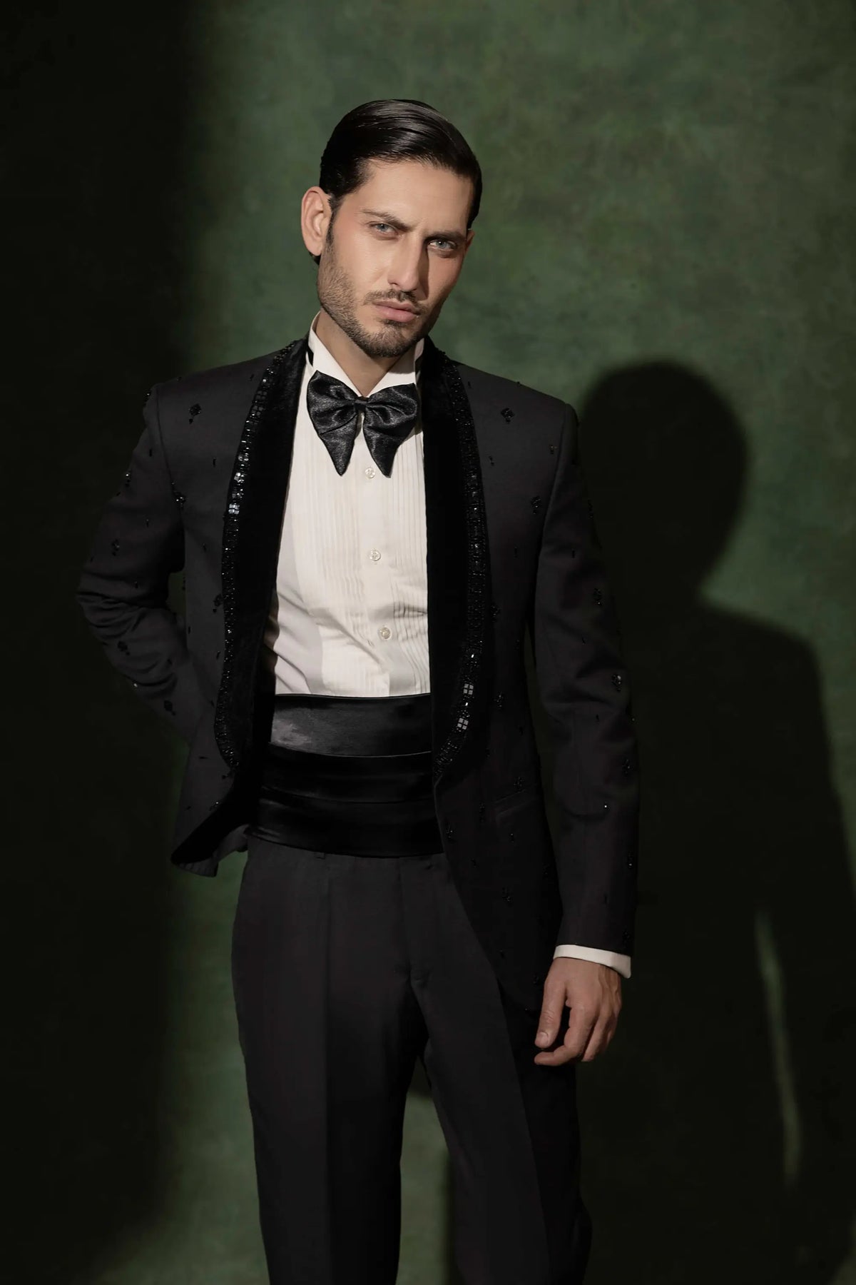Bespoke embellished suit paired with tux shirt, silk waist belt and butterfly made with high grade tropical fabric.