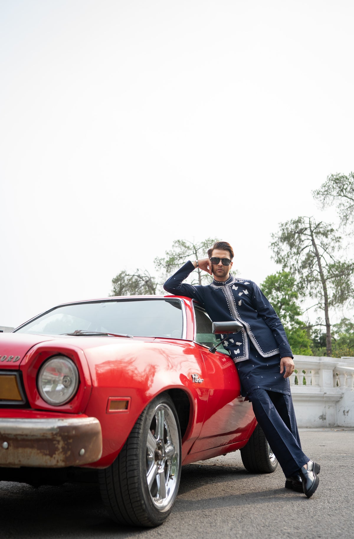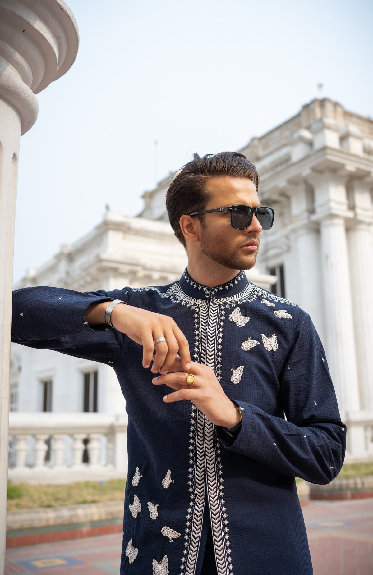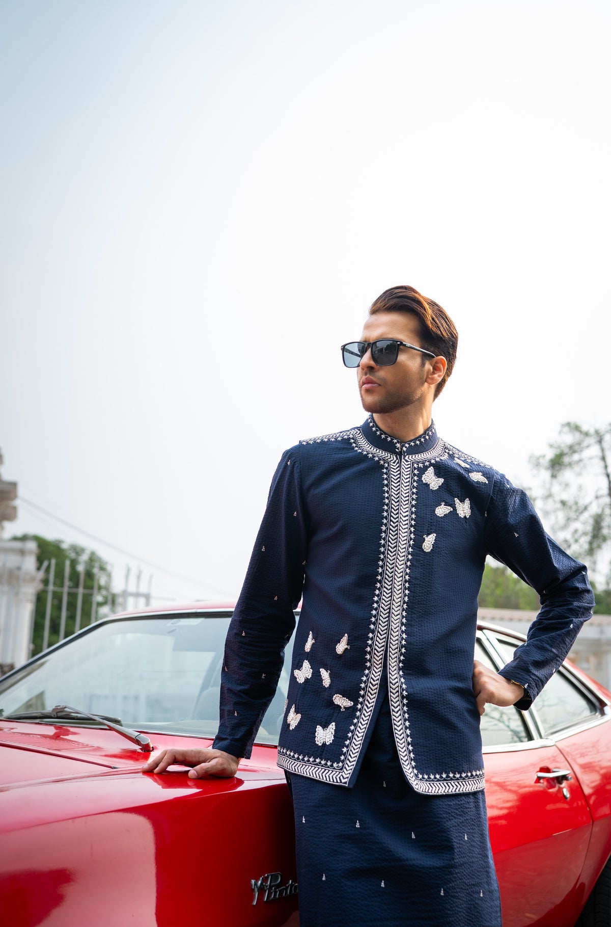 - Kurta Pajama with sleeve embroidery - Pure cotton seersuker fabric - Embroidered and embellished Waistcoat in seersuker fabric