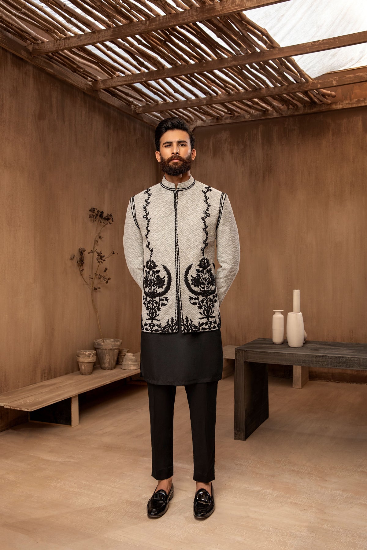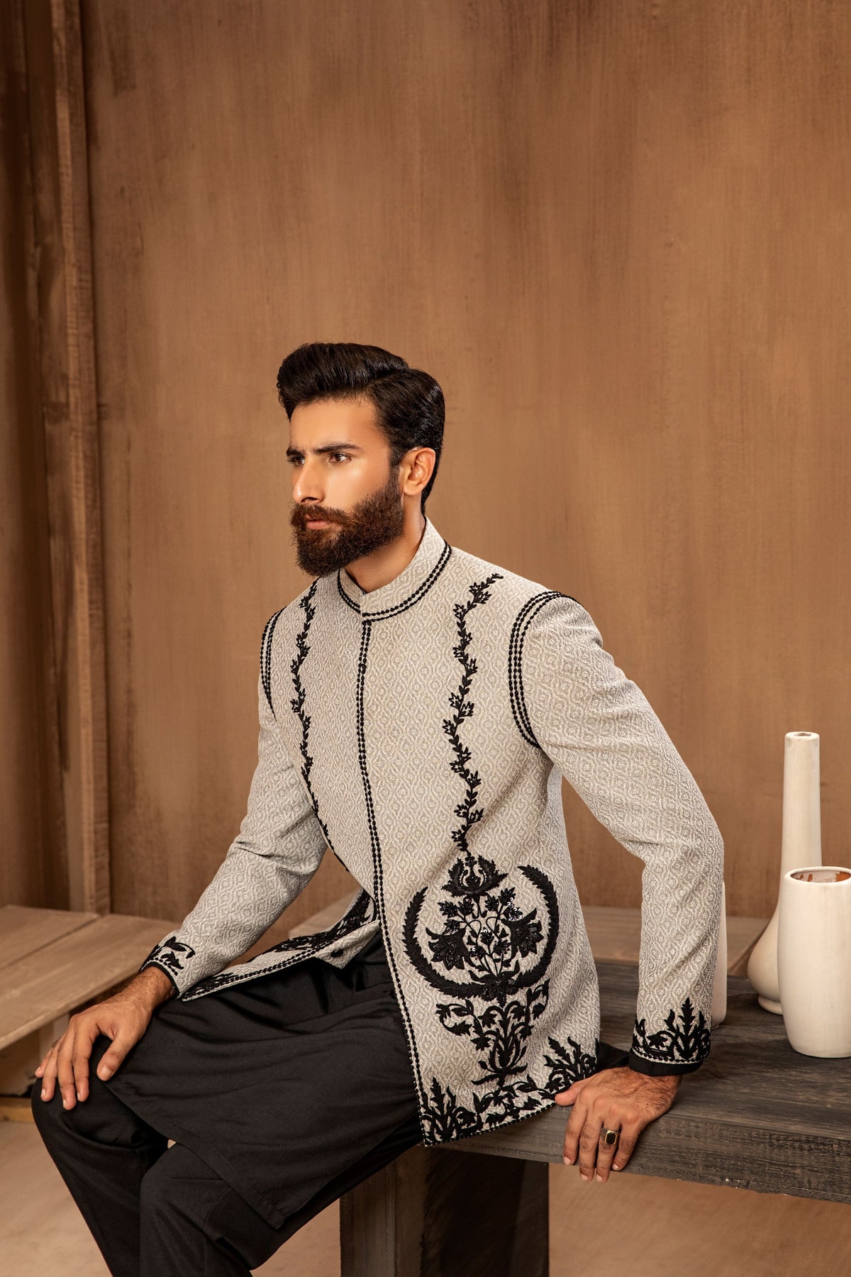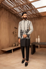 This elegance grey prince coat with Anker work and floral motifs made on a pure ayodhiya fabric