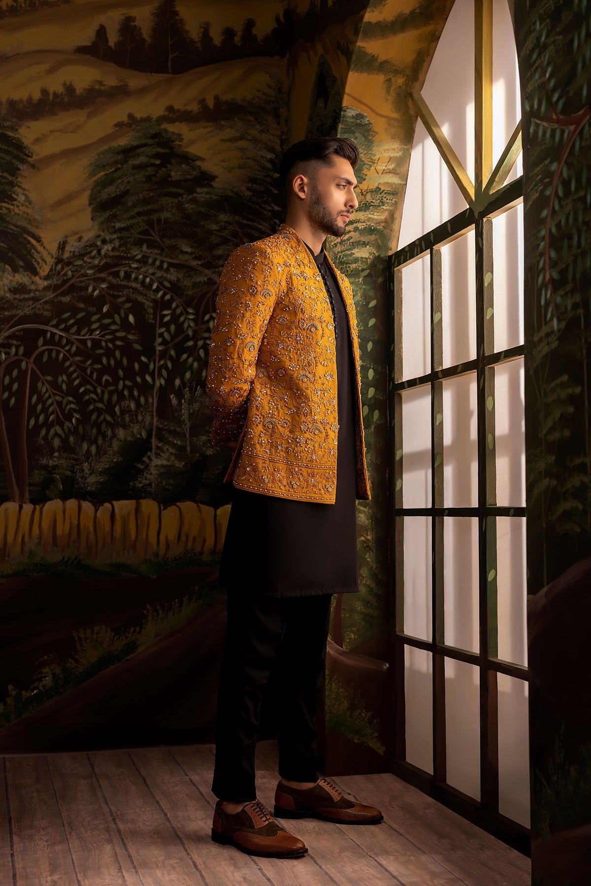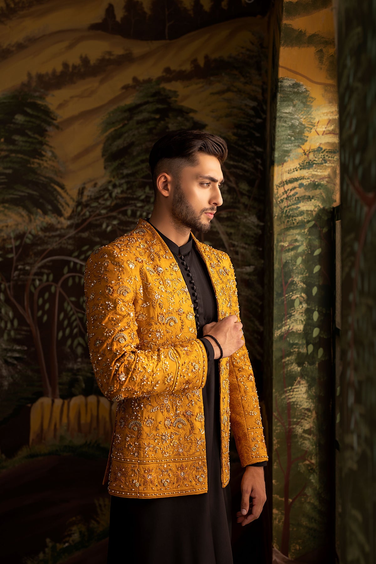 All over embroidered mustard shawl neck open prince coat with hand embellishment, French nodes, shell per, Japanese cut, kora work and gem stones