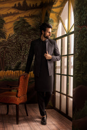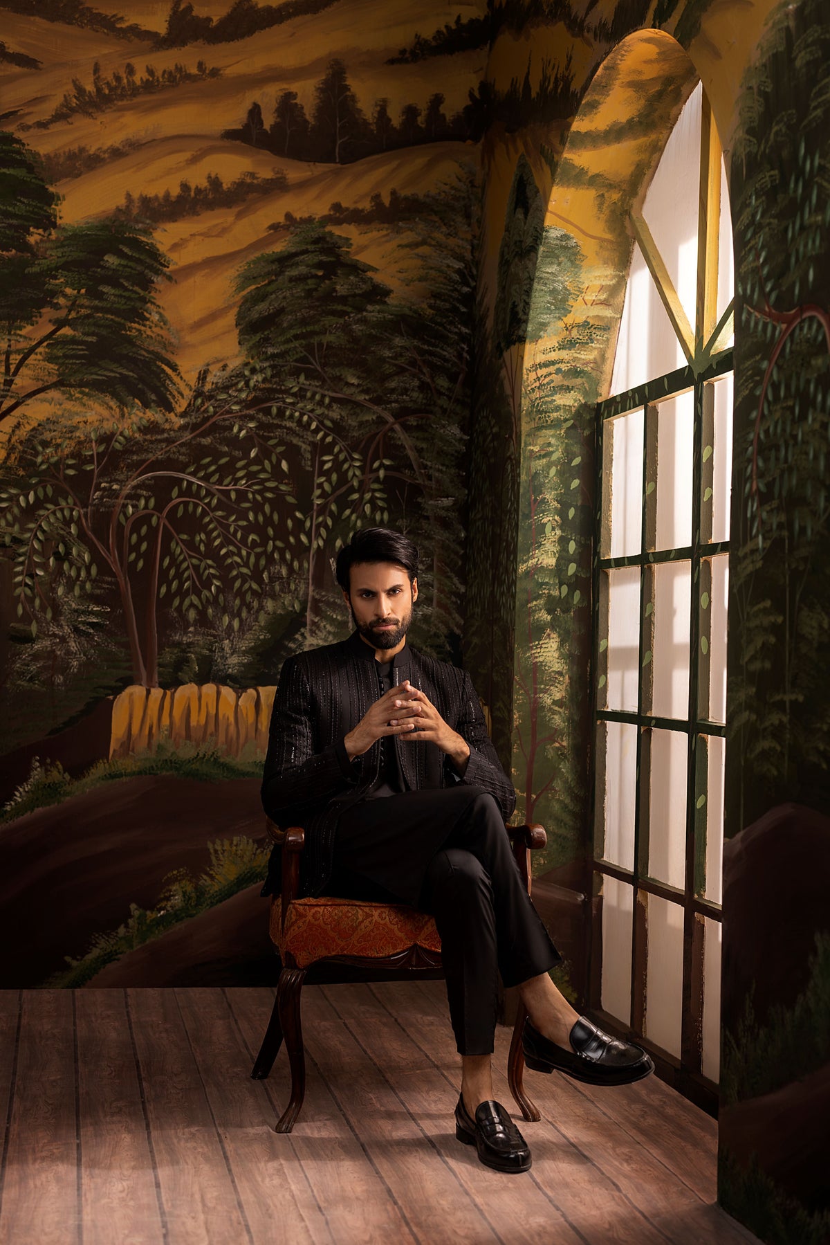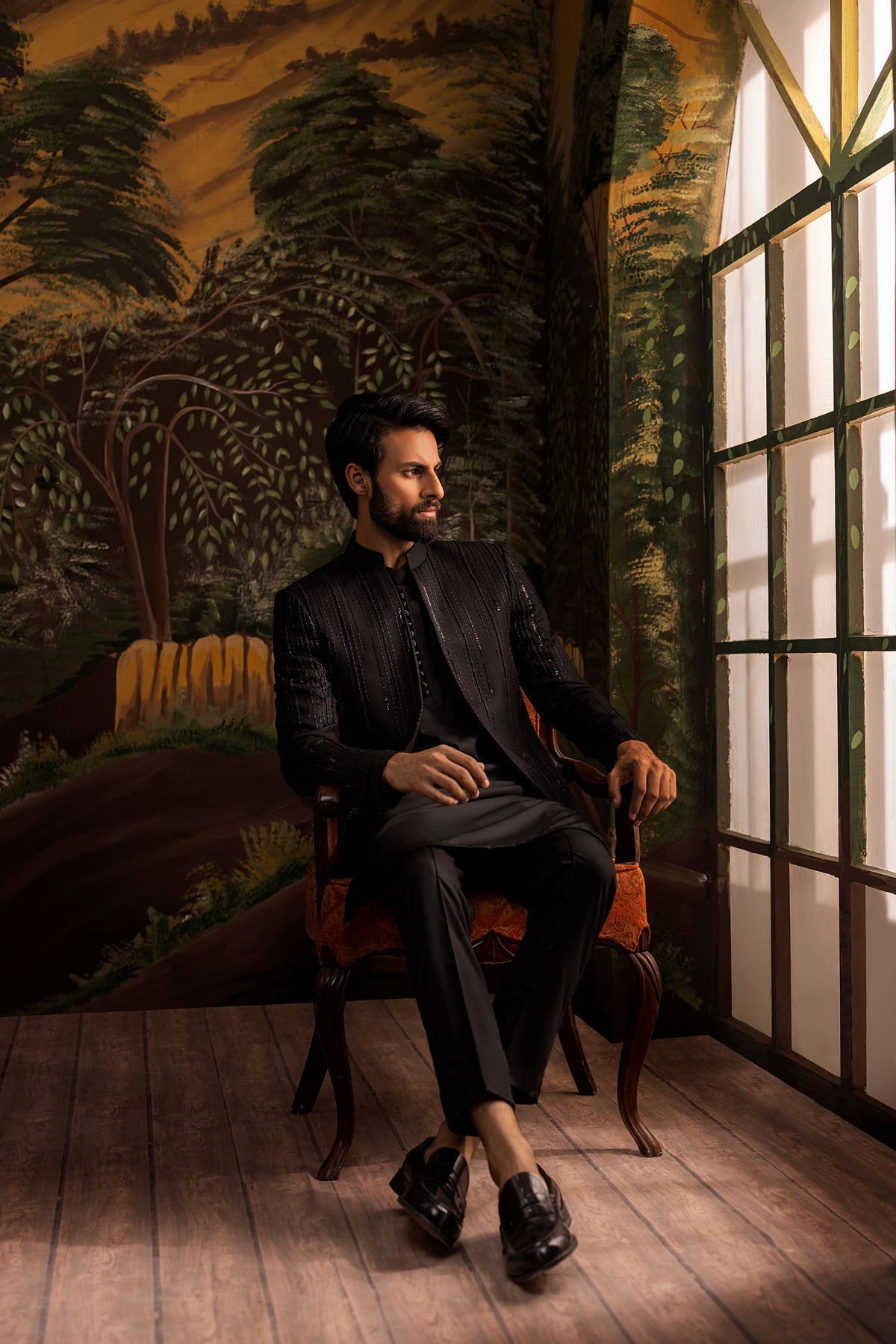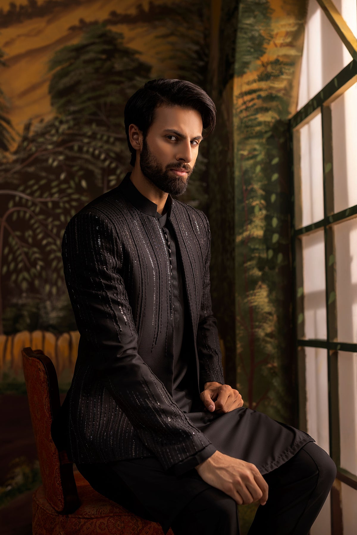 Regal elegance. This black vertical stripes prince coat with hand embellishment and chawal tanka is a true masterpiece of craftsmanship and style.