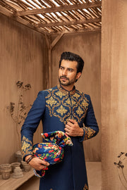 Aesthetically done floral patterned sherwani on a plain fabric with Hand embellishment and hand embroidery. Handwork includes a beautiful blend of Anchor and metallic threads, kora, dabka, cut dana and wooden motti.
