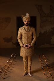 Beautifully done hand-crafted Islamic architecture-inspired sherwani with metallic threads and materials. Paired with plain kurta trouser, turban and same shoes