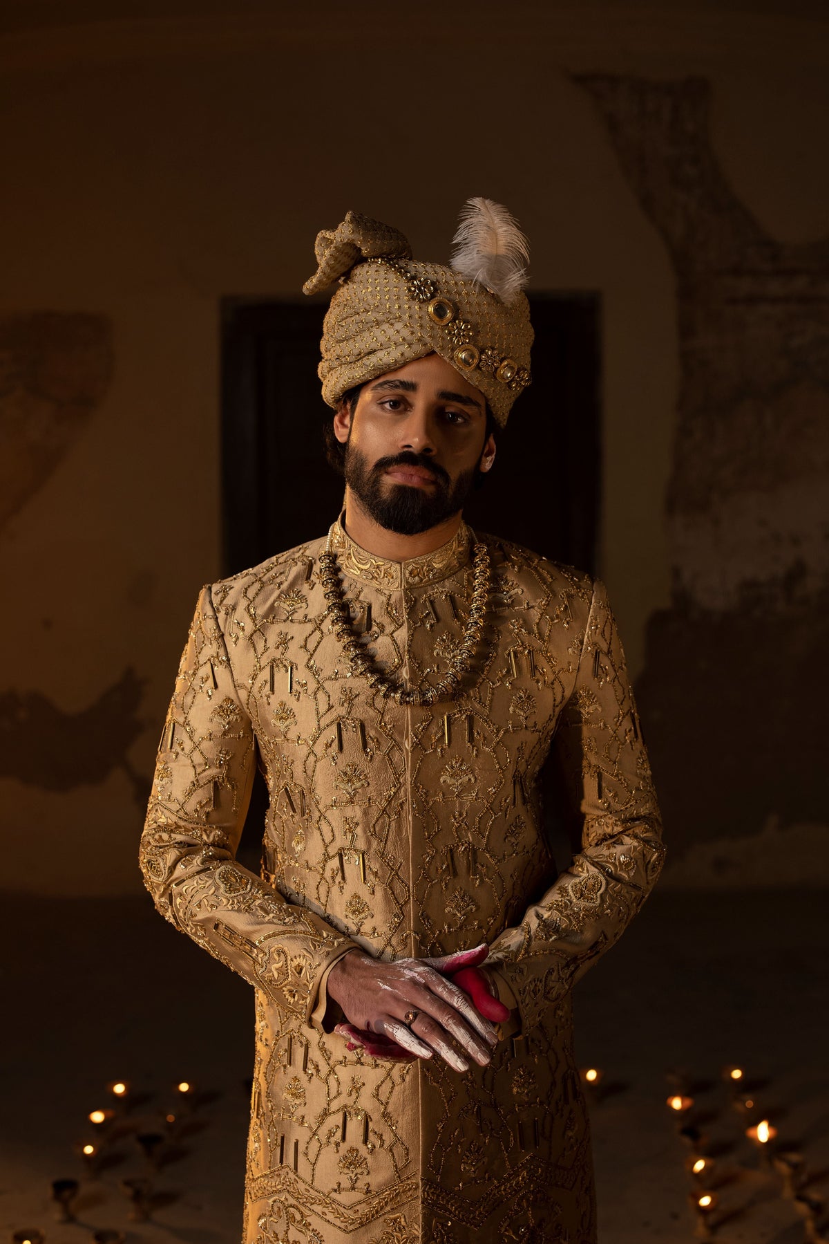 Beautifully done hand-crafted Islamic architecture-inspired sherwani with metallic threads and materials. Paired with plain kurta trouser, turban and same shoes...