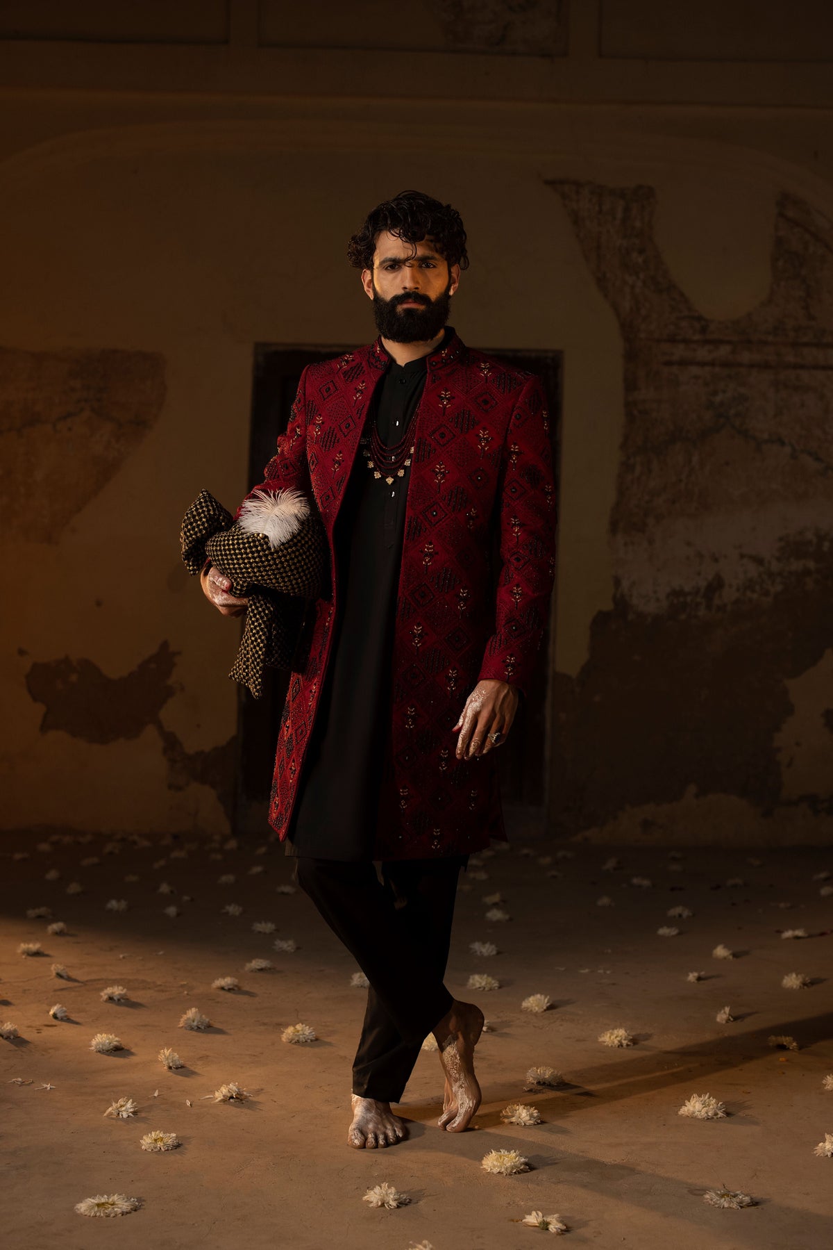 Allover embroidered in mixed block shapes open sherwani with hand embellishment. Paired with plain kurta trouser, turban and same shoes