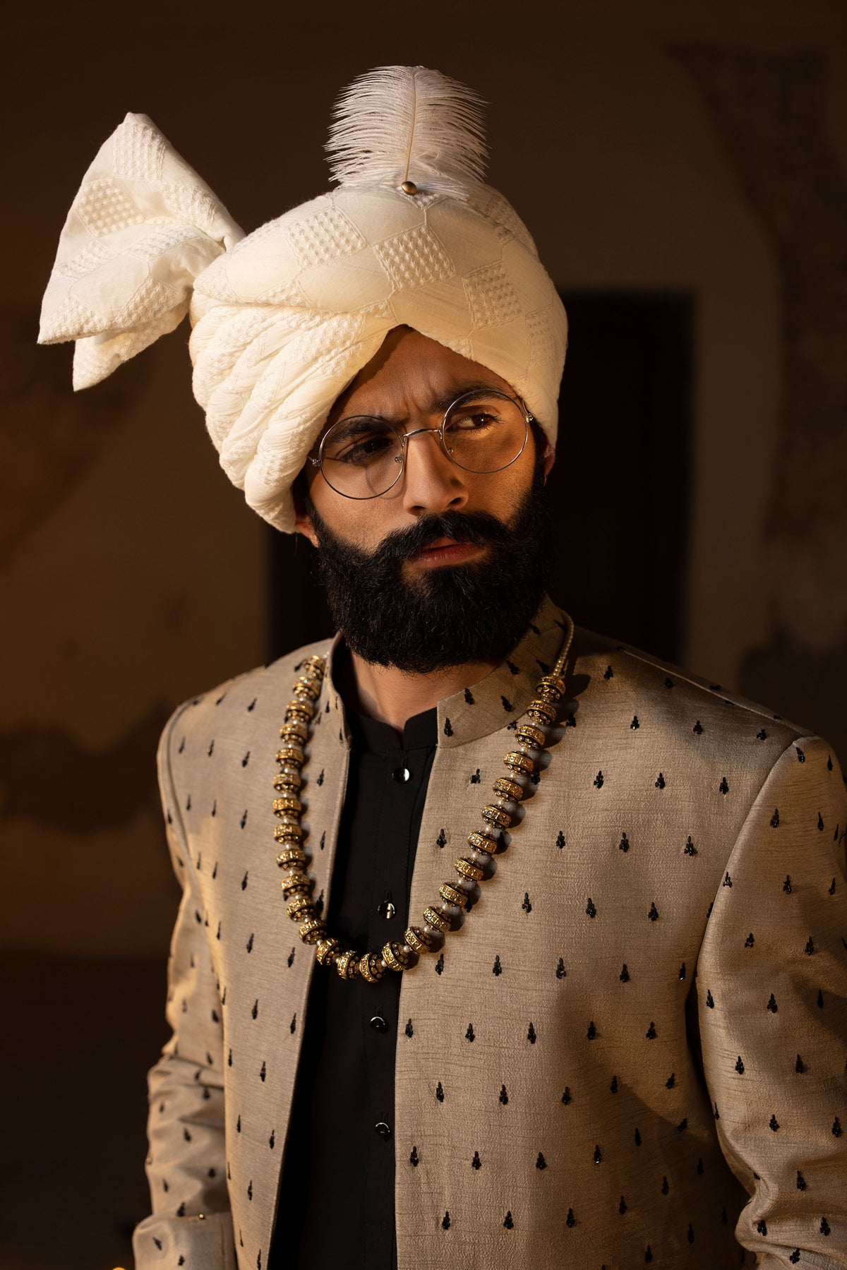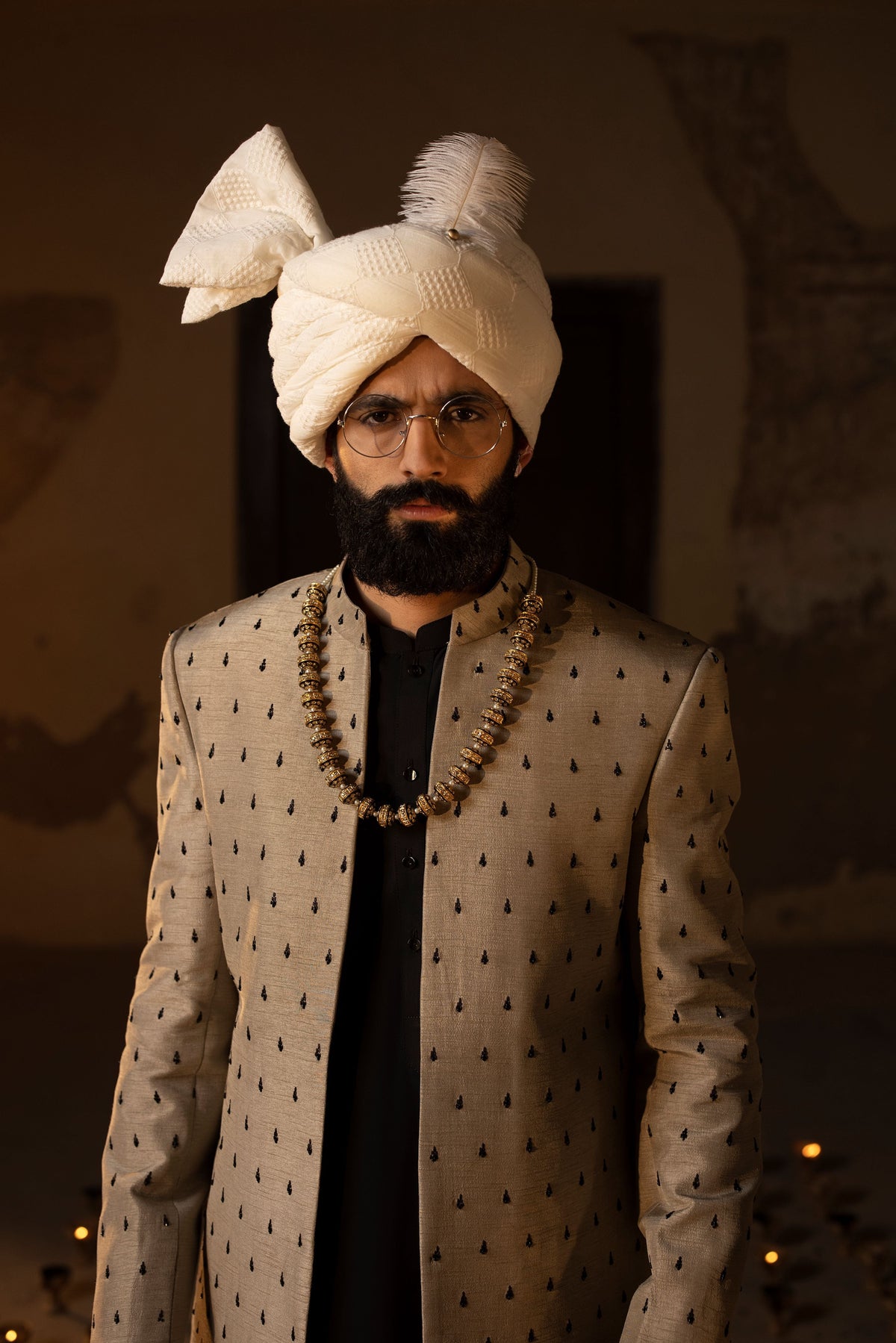 Allover miniature hand-sprayed sherwani. Paired with plain kurta trouser, turban and same shoes