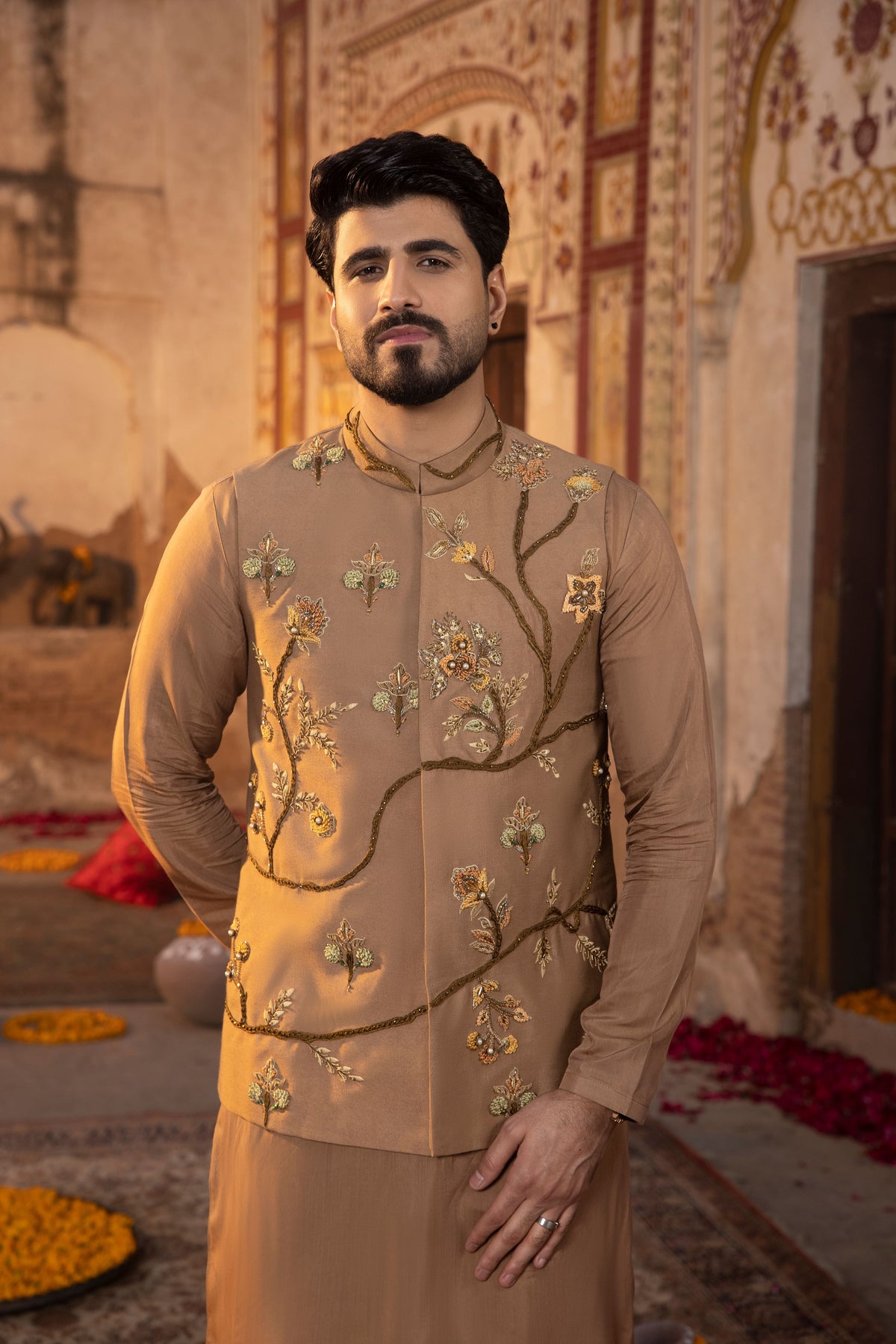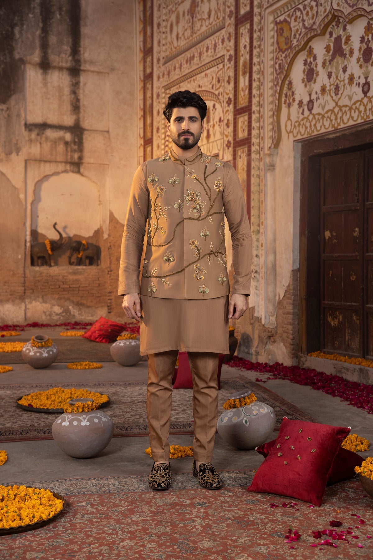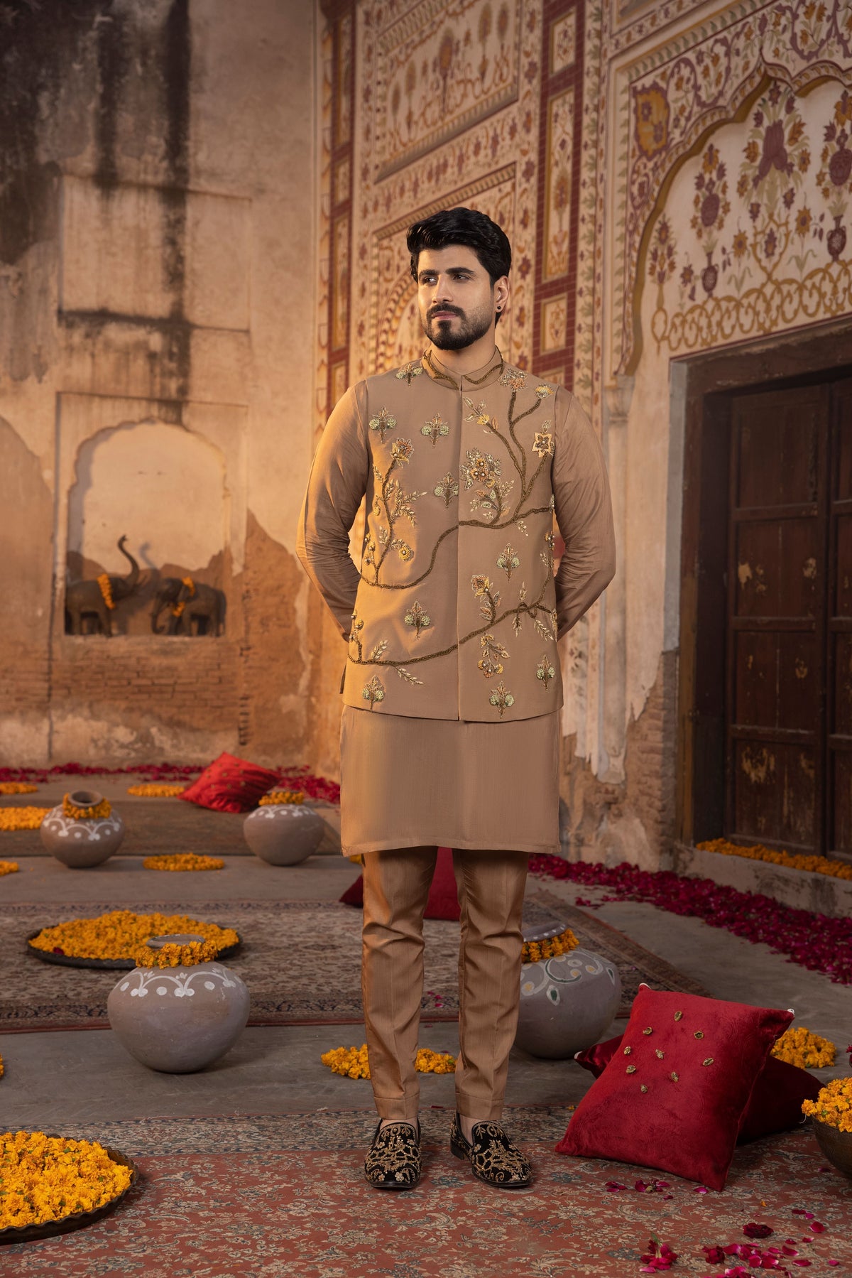Cotton khadi silk pure waistcoat with heavy resham embroidery and mixture of hand embellishment techniques while using different hi quality materials.