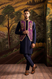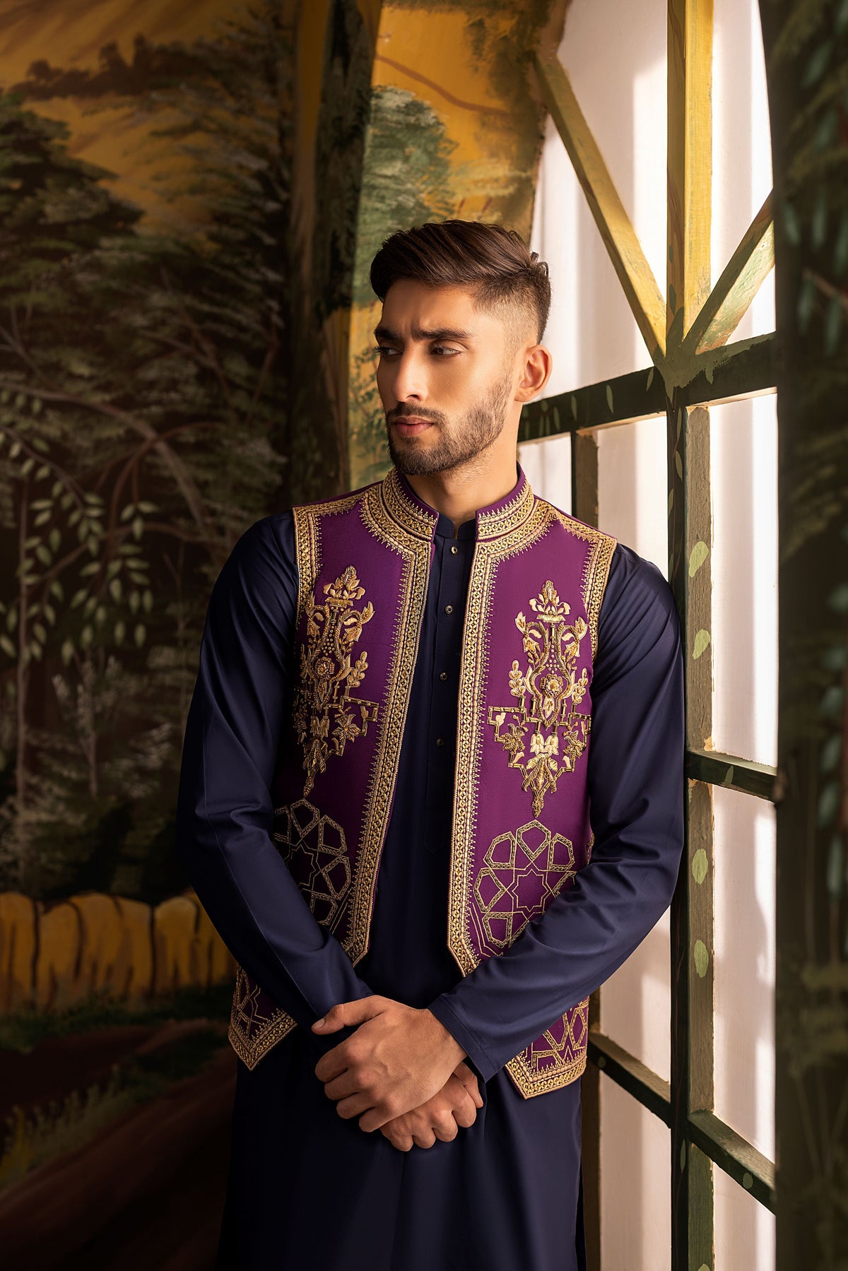 Purple Metallic thread waistcoat with intricate Islamic motifs, made on a cotton khadi silk.
