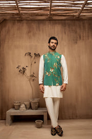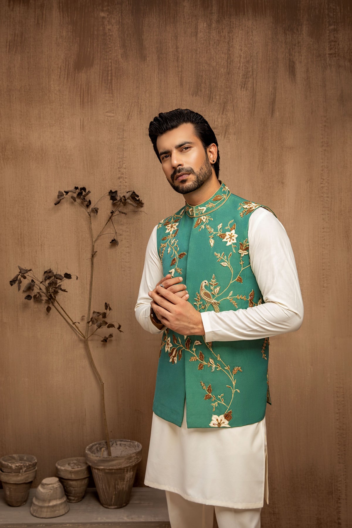 Aqua marine waistcoat with multiple work: hand embroidery, metallic thread work, hand embellishment with a bird motif