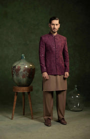 Allover embroidered prince coat with mirror work. Paired with contrast color silk kurta and trousers