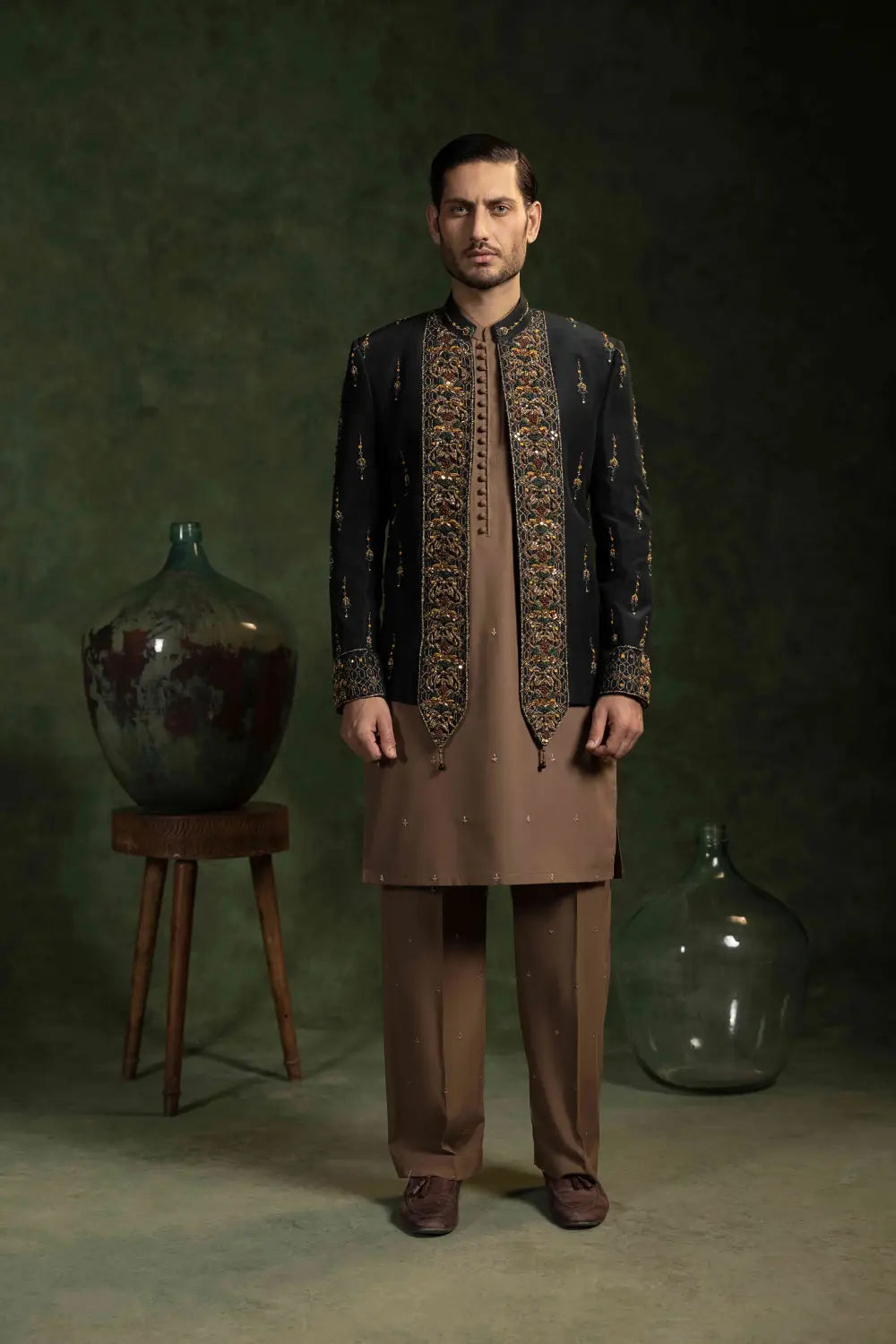 Pure silk open straight extended panel embellished prince coat with metallic thread and resham embroidery and hand embellishment. Paired with contrast color silk kurta and trousers