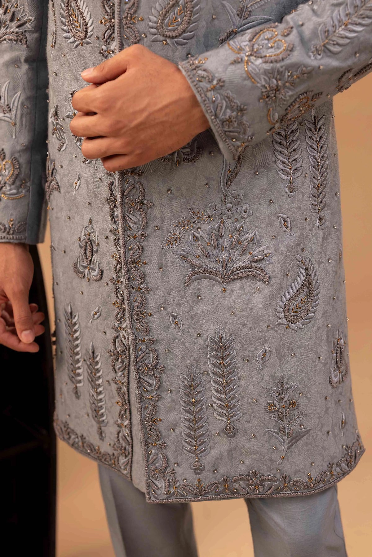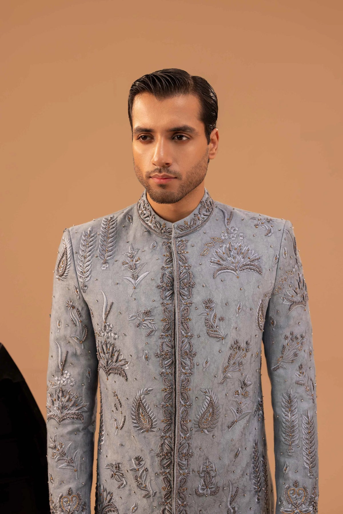 Heavy embellished sherwani with high quality materials on allover embroidered pattern. Paired with same color inner kurta trouser, embellished shoes and turban