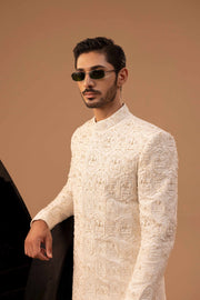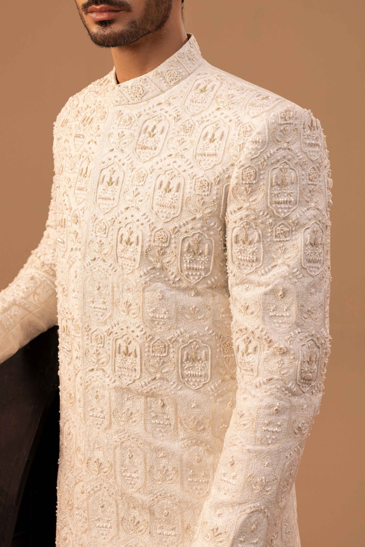 Heavy embellished sherwani with high quality materials on allover embroidered pattern. Paired with same color inner kurta trouser, embellished shoes and turban