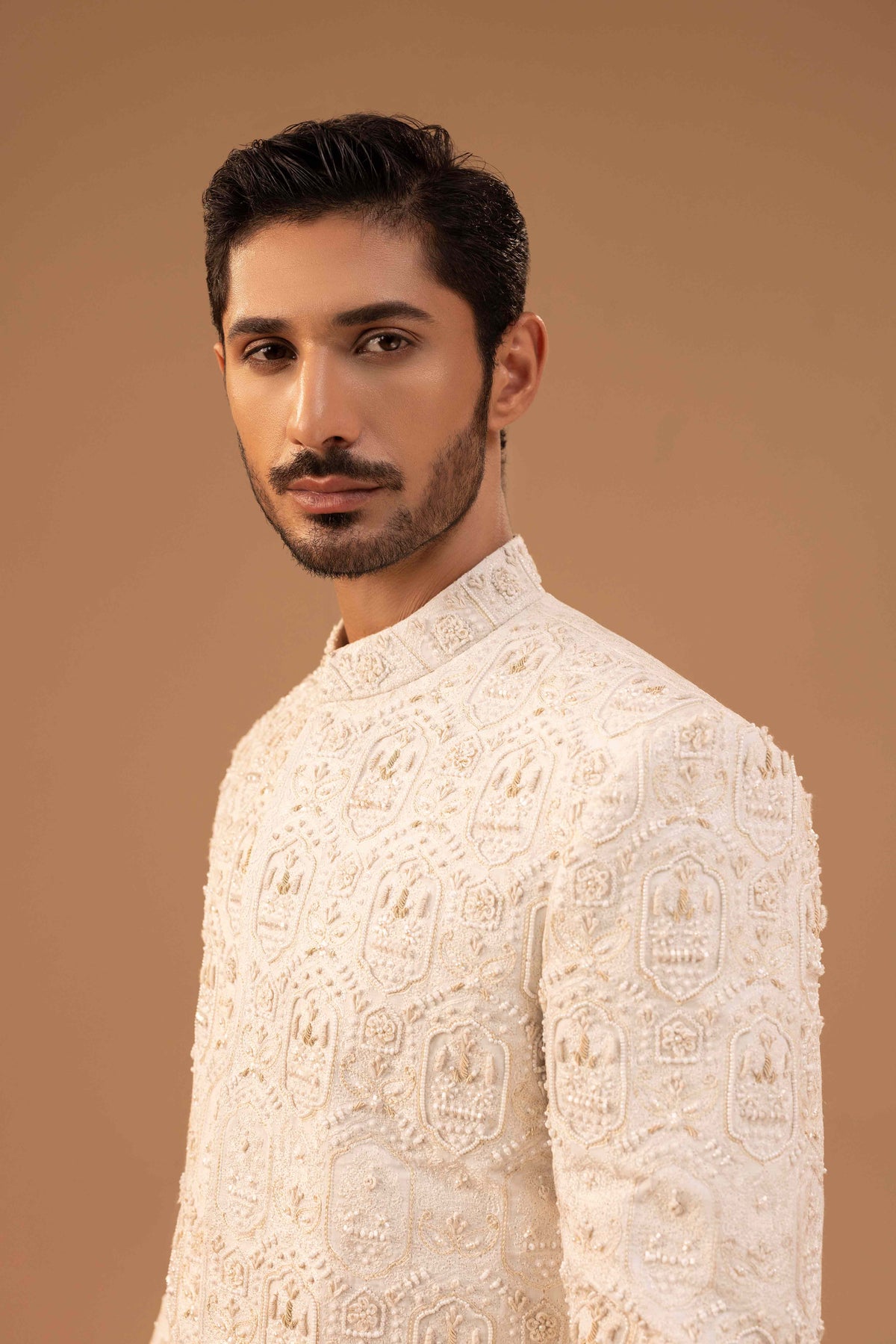 Heavy embellished sherwani with high quality materials on allover embroidered pattern. Paired with same color inner kurta trouser, embellished shoes and...