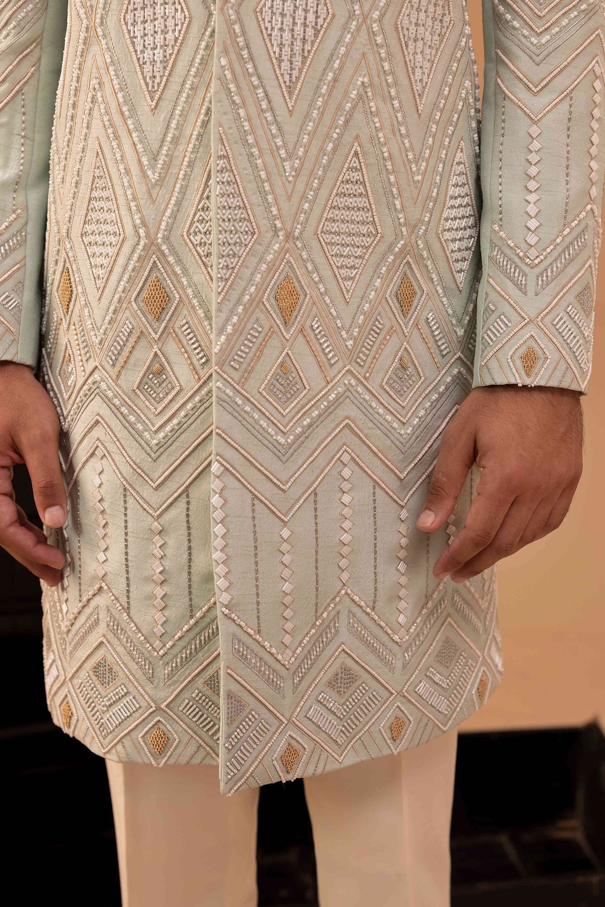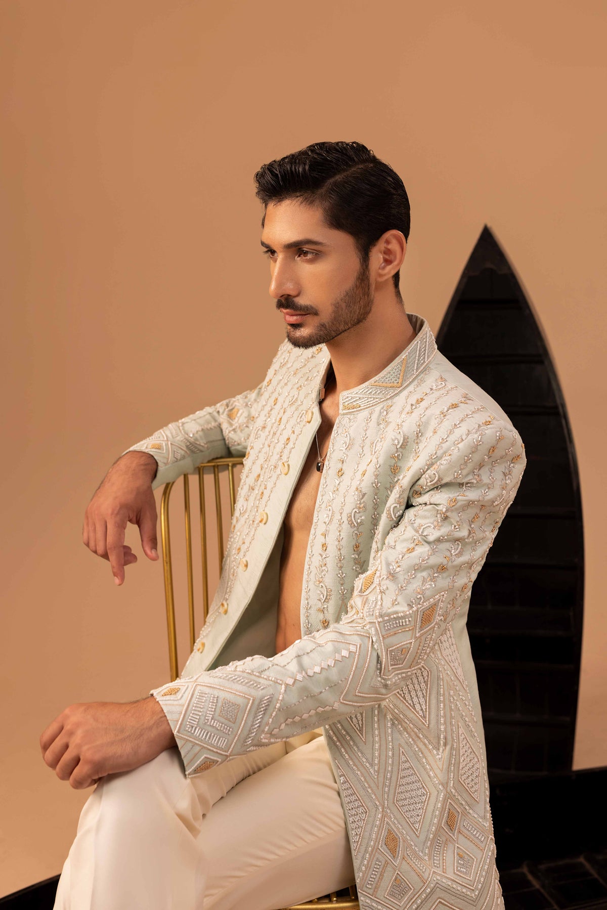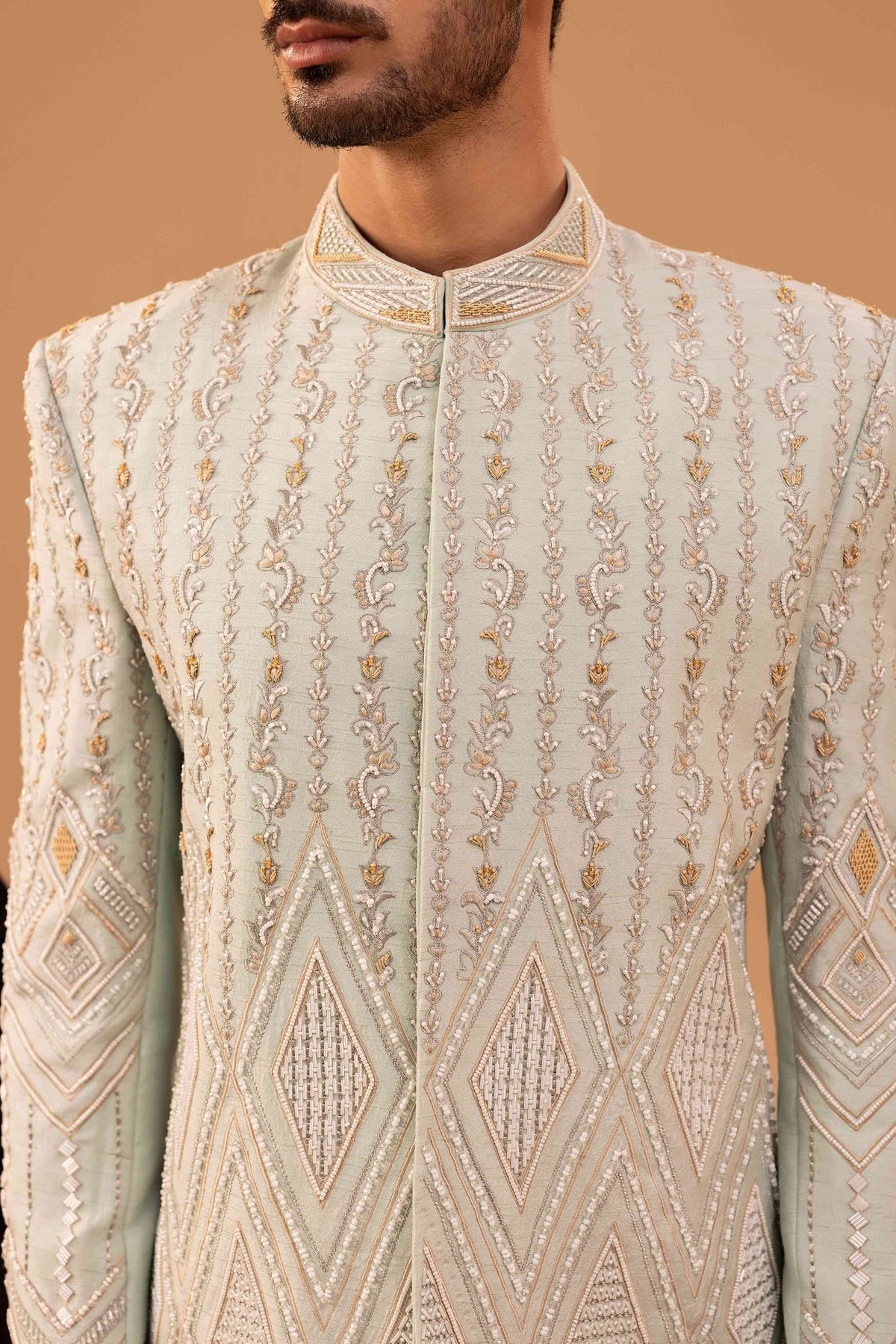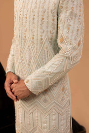 A fine blend of pakki work includes metallic and plain thread and hand embellishment on a pure plain base. Paired with same color inner kurta trouser, embellished shoes and turban