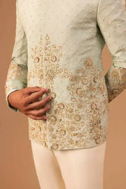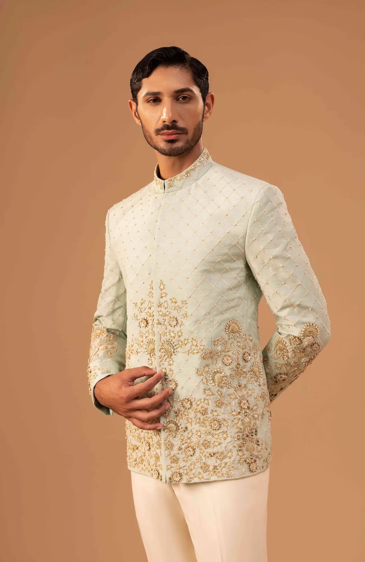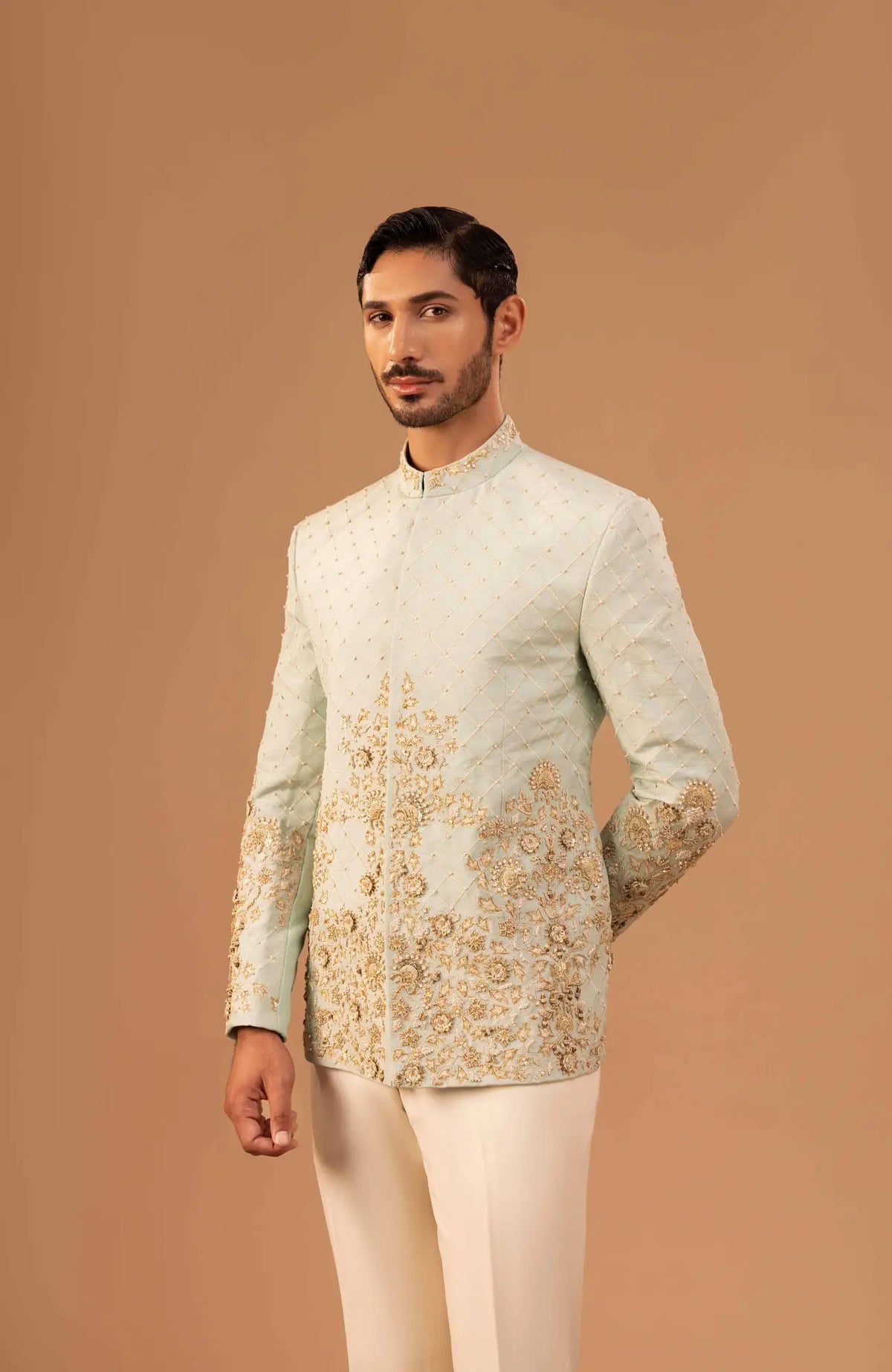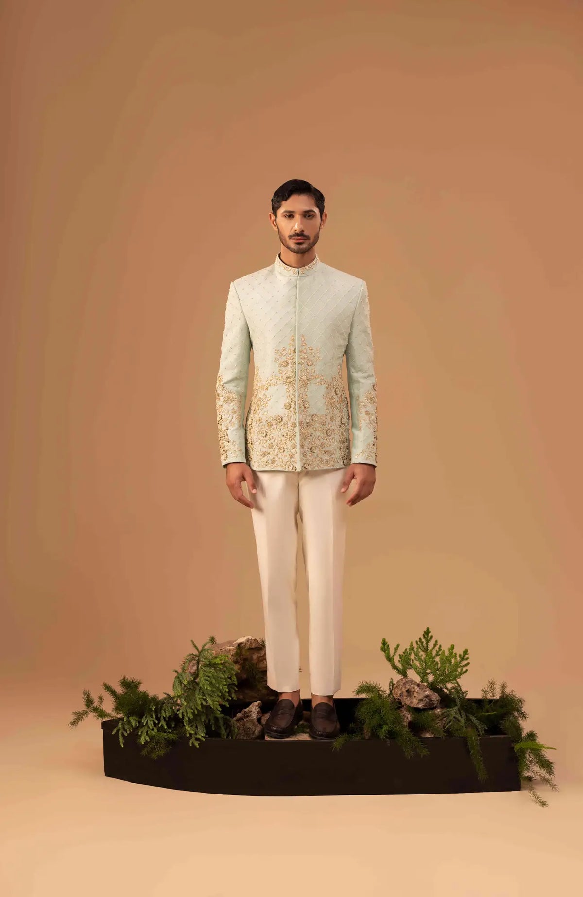 Fine tailored embellished nehru jacket that includes pitta, zardozi and metallic thread work made on a pure silk fabric. A perfect piece for your subtle event. Paired with simple kurta trouser or pants.