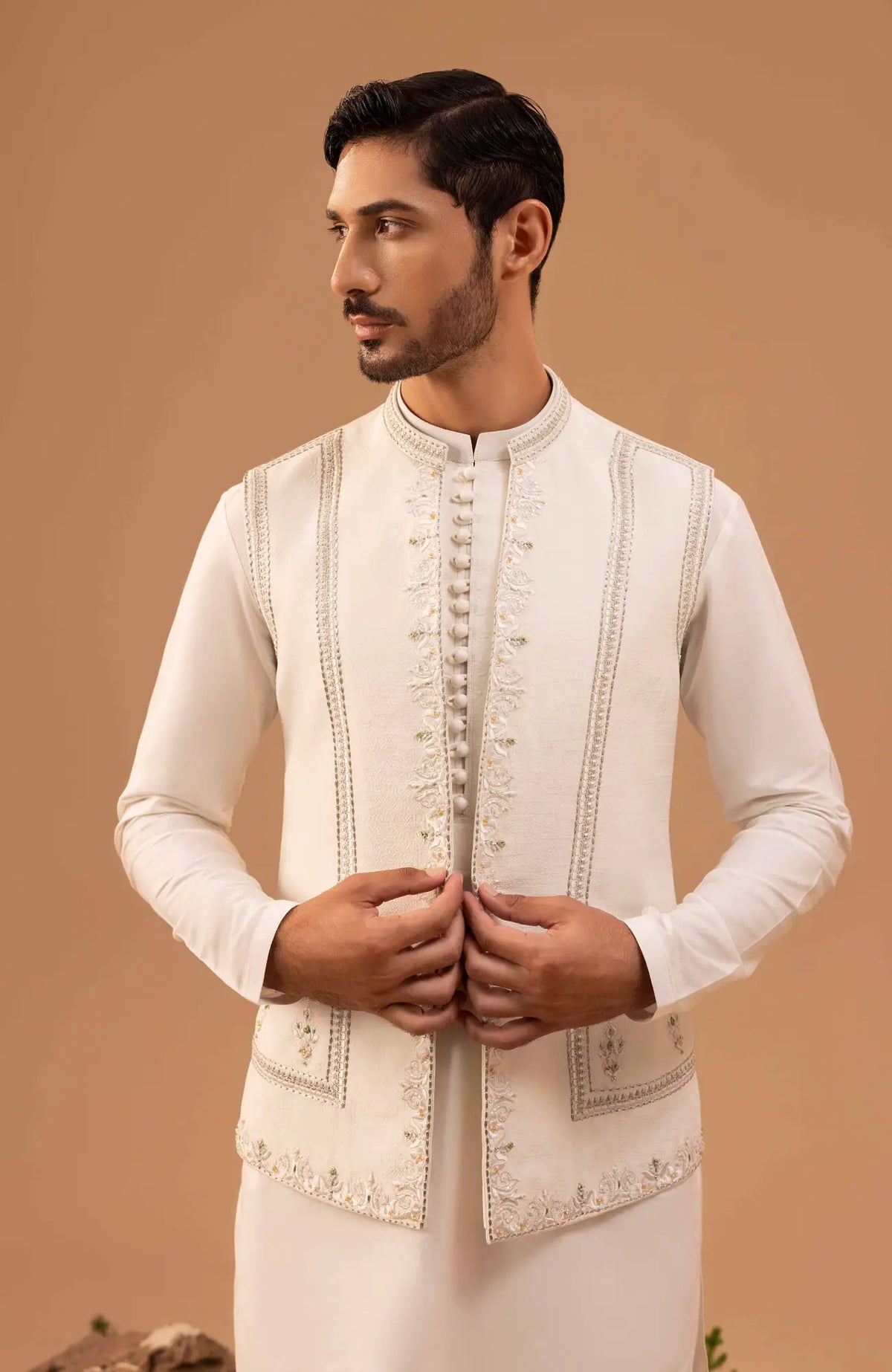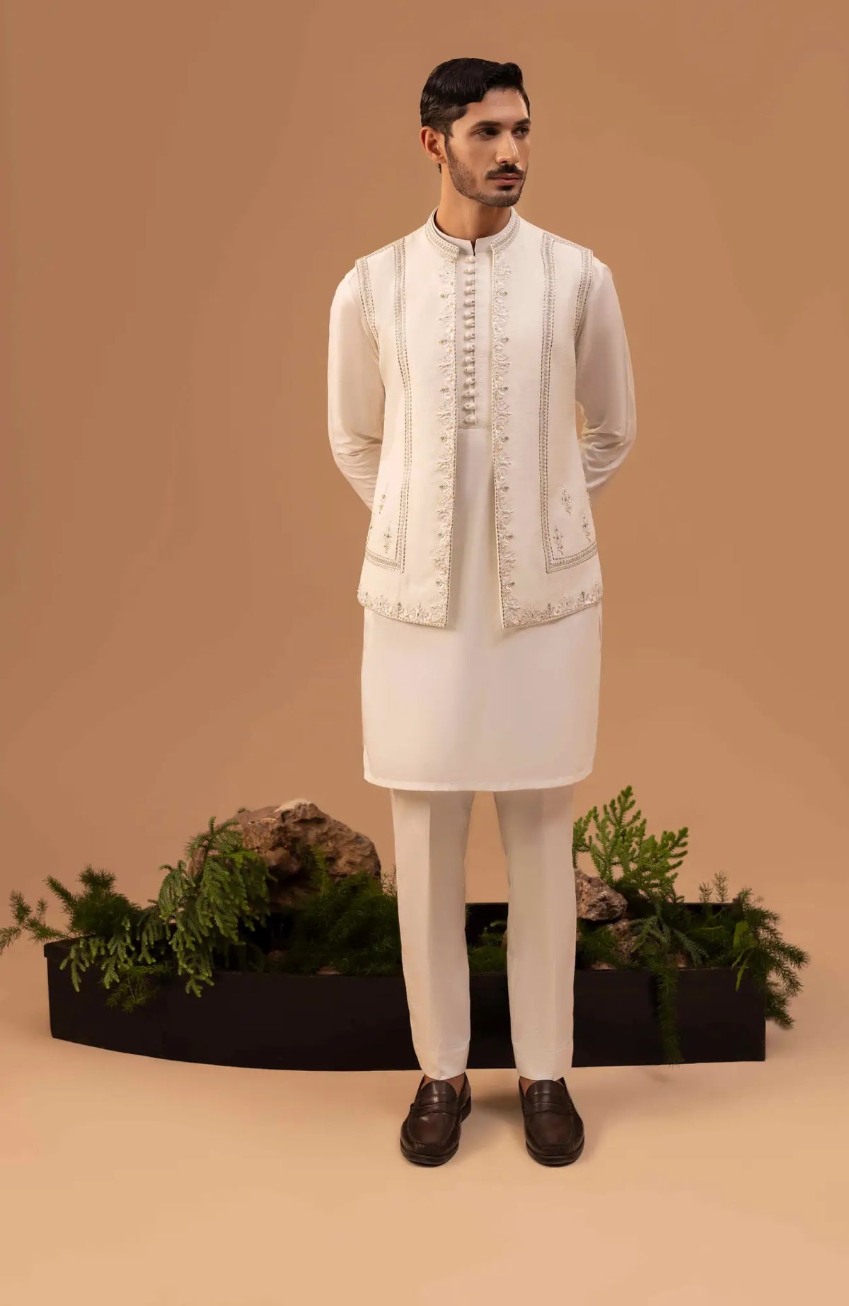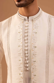 Nice tailored open straight waistcoat with geometrical and floral pattern borders includes metallic thread work, crystal and resham work. Paired with same color silk loop buttons kurta and trousers.