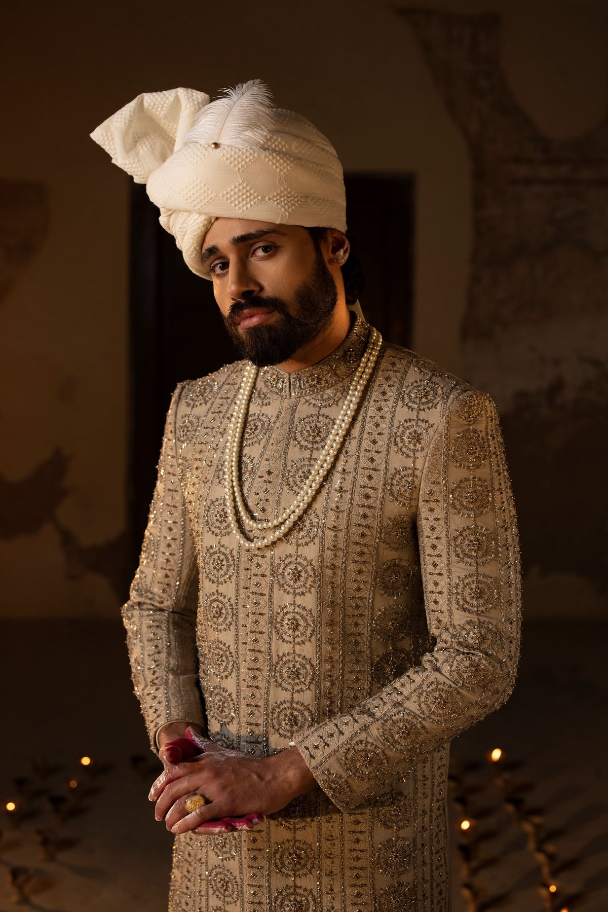 Patterned allover embroidered sherwani with metallic look hand embellishment. Paired with plain kurta trouser, turban and same shoes